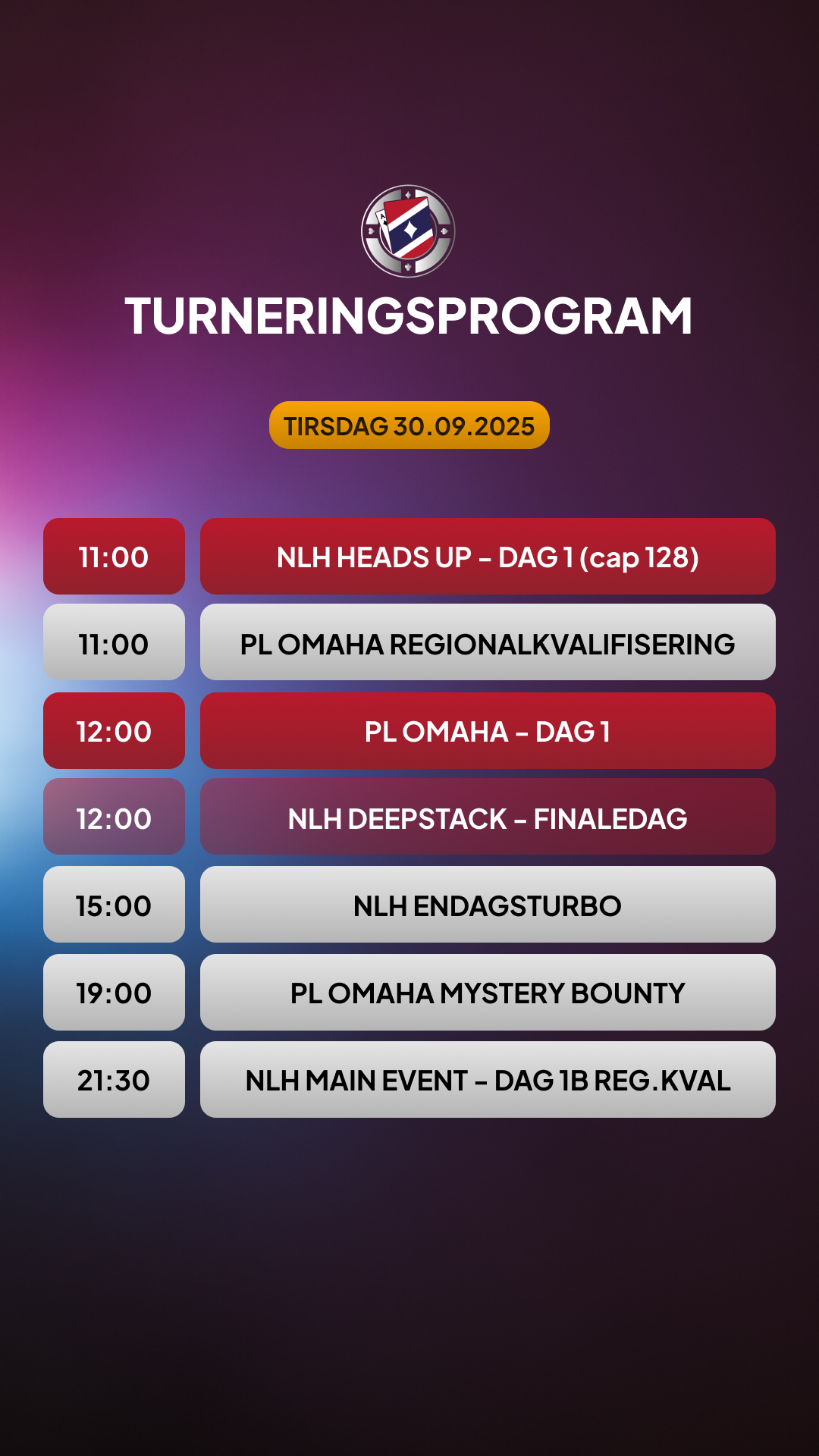 I tillegg til titteløvelsene starter også en 2 500 kr NLH Endagsturbo kl 15:00 og 2 500 kr PL Omaha Mystery Bounty kl 19:00. Til slutt avrundes kvelden med en 1 250 kr NLH regionalkvalifisering til Main Event dag 1B.