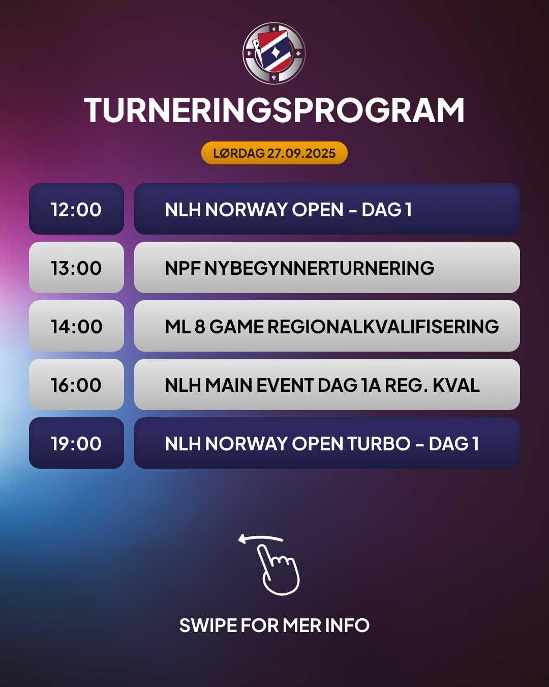 Lørdag 27. september starter det tiende norgesmesterskapet i poker! Arrangementet varer frem til og med søndag 5. oktober og hele 10 norgesmestere skal kåres.